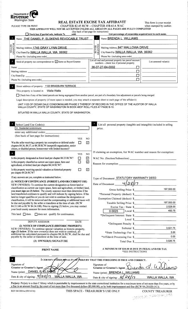 | 2 | 04/28/2017 | SWD | STATUTORY WARRANTY DEED | THE DANIEL P ELSKENS REVOCABLE TRUST | WILLIAMS BRENDA L | | | $197,500.00 | 132285 | 2017-03194 |