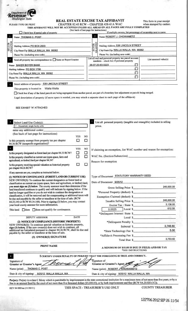 | 4 | 09/26/2012 | WARRANTY D | WARRANTY DEED | POST, THOMAS C | CHOWANIETZ, ROBERT J | | | $245,000.00 | 122706 | 2012-08426 |