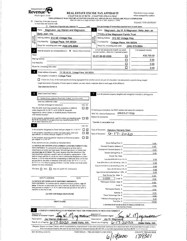| 1 | 06/17/2020 | SWD | STATUTORY WARRANTY DEED | MAGNUSON JAY & BETTY JEAN | MAGNUSON FAMILY TRUST | | | $0.00 | 139301 | 2020-05532 |