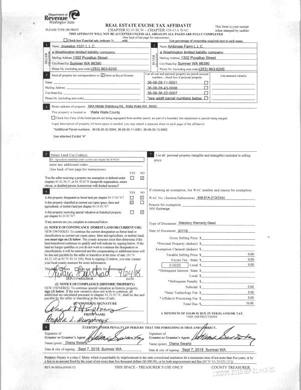 | 1 | 09/07/2018 | SWD | STATUTORY WARRANTY DEED | INVESTCO 1031 LLC | AMBROSE FARM LLC | 6 PARCELS | | $0.00 | 135595 | 2018-07890 |