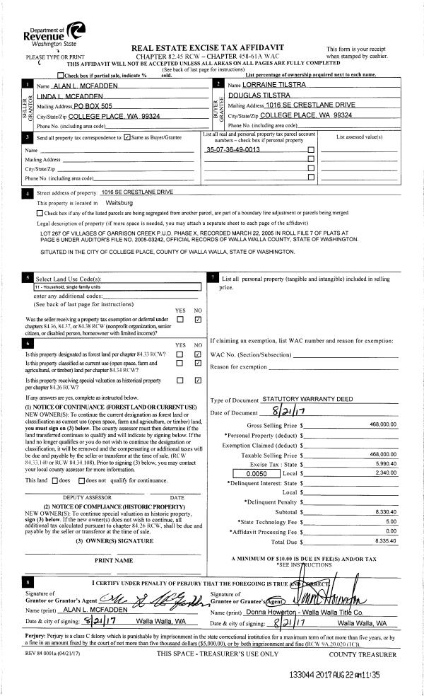 | 2 | 08/22/2017 | SWD | STATUTORY WARRANTY DEED | MC FADDEN ALAN L & LINDA L | TILSTRA DOUGLAS & LORRAINE | | | $468,000.00 | 133044 | 2017-06505 |