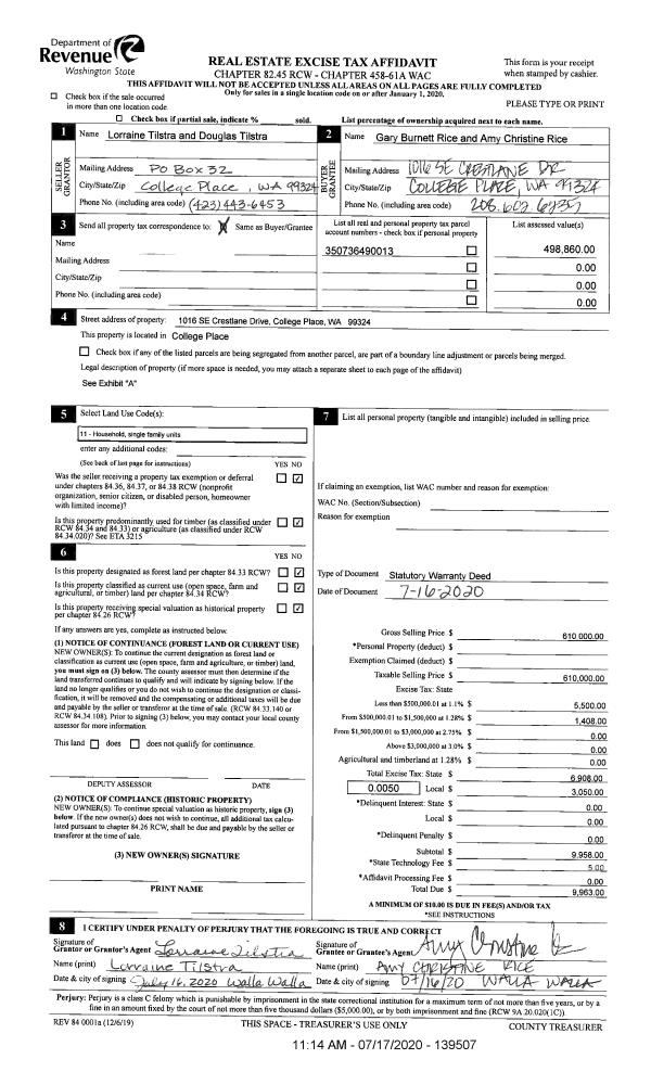 | 1 | 07/17/2020 | SWD | STATUTORY WARRANTY DEED | TILSTRA DOUGLAS & LORRAINE | RICE GARY BURNETT & AMY CHRISTINE | | | $610,000.00 | 139507 | 2020-06872 |