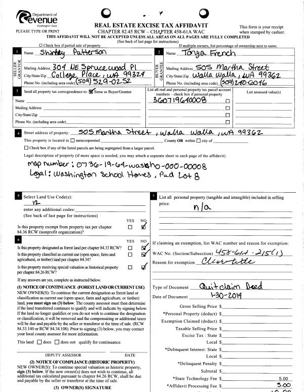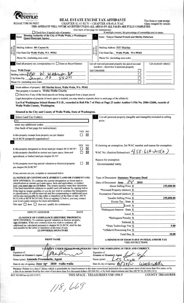 | 3 | 06/28/2010 | WARRANTY D | WARRANTY DEED | WALLA WALLA HOUSING AUTHORITY | FRENCH, TONYA C | | | $155,000.00 | 118669 | 2010-04991 |