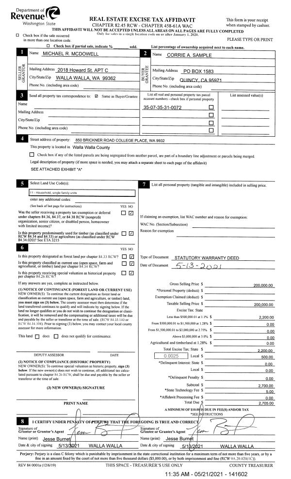 | 2 | 05/21/2021 | SWD | STATUTORY WARRANTY DEED | MC DOWELL MICHAEL R | SAMPLE CORRIE A | | | $200,000.00 | 141602 | 2021-06167 |