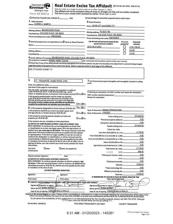 | 1 | 01/20/2023 | SWD | STATUTORY WARRANTY DEED | SAMPLE CORRIE A | OTT KEVIN & IONNE | | | $374,400.00 | 145281 | 2023-00287 |