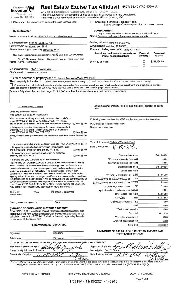 | 1 | 11/14/2025 | SWD | STATUTORY WARRANTY DEED | SIMON CORY T & JAIME L | BOARD OF TRUSTEES OF WHITMAN COLLEGE | | | $479,000.00 | 150361 | 2025-07065 |