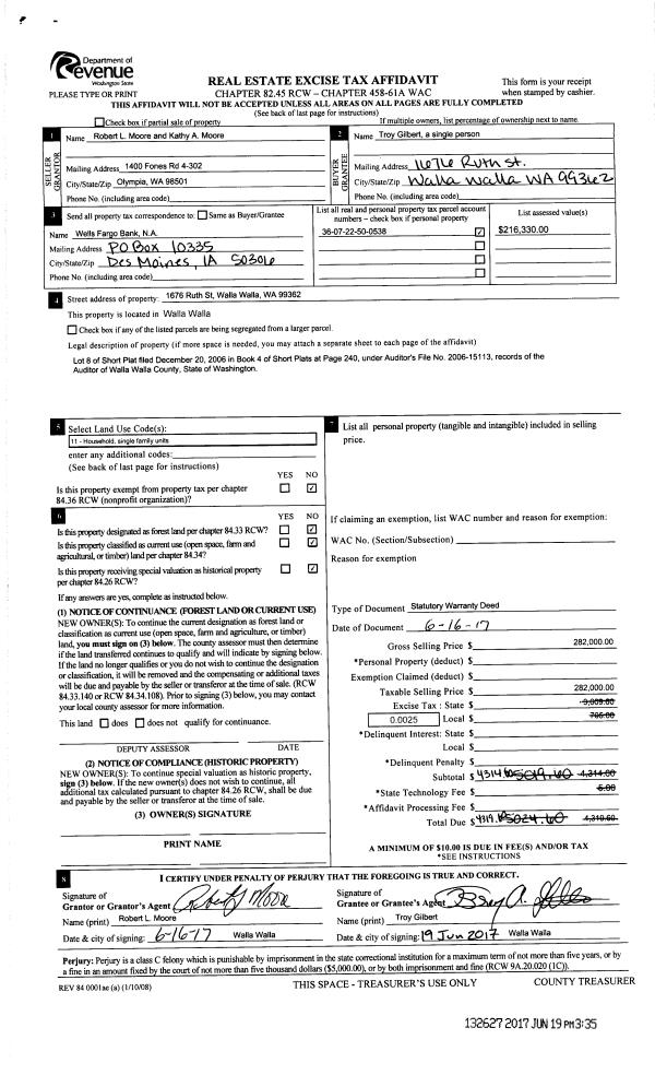 | 1 | 06/19/2017 | SWD | STATUTORY WARRANTY DEED | MOORE ROBERT L & KATHY A | GILBERT TROY A | | | $282,000.00 | 132627 | 2017-04671 |
