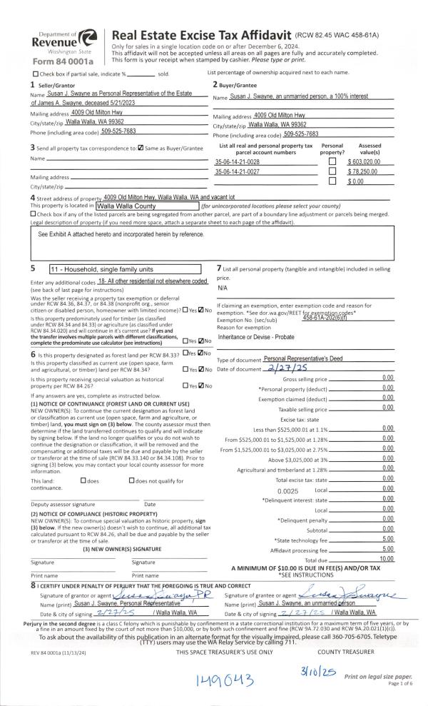 | 1 | 03/10/2025 | DPR | DEED OF PERSONAL REPRESENTATIVE | SWAYNE JAMES A | SWAYNE SUSAN J | | | | 149043 | 2025-01251 |