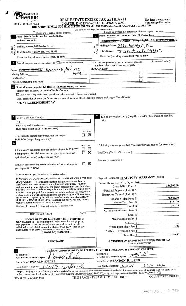 | 2 | 06/13/2014 | SWD | STATUTORY WARRANTY DEED | SNIDER DONALD L & MARANATHA D | LENO BRANDON R | | | $136,500.00 | 126070 | 2014-04101 |