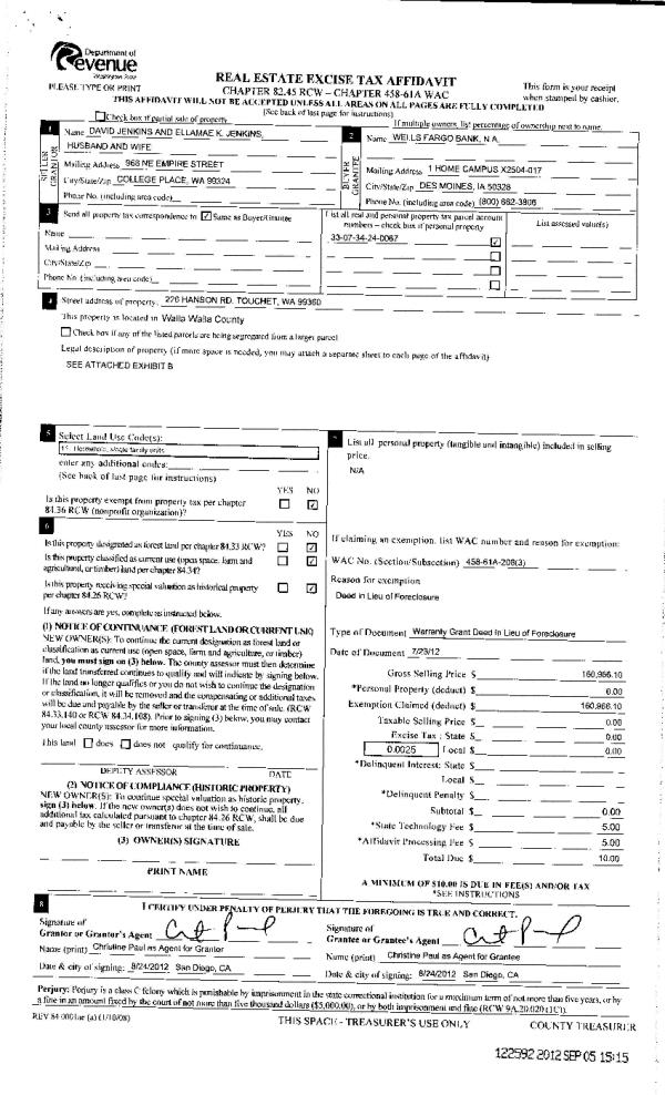 | 4 | 09/05/2012 | WARRANTY D | WARRANTY DEED | JENKINS, DAVID & ELLAMAE | WELLS FARGO BANK NA | | | $160,966.00 | 122592 | 2012-07782 |