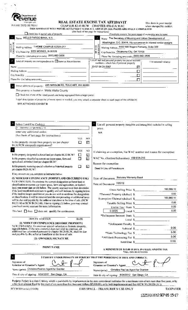 | 5 | 09/05/2012 | WARRANTY D | WARRANTY DEED | WELLS FARGO BANK NA | SECRETARY OF HOUSING & URBAN D | | | $160,966.00 | 122593 | 2012-07784 |