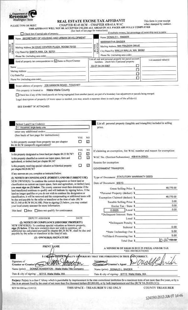 | 3 | 06/07/2013 | WARRANTY D | WARRANTY DEED | SECRETARY OF HOUSING & URBAN D | SNIDER, DONALD L & MARANATHA D | | | $46,770.00 | 124090 | 2013-05767 |