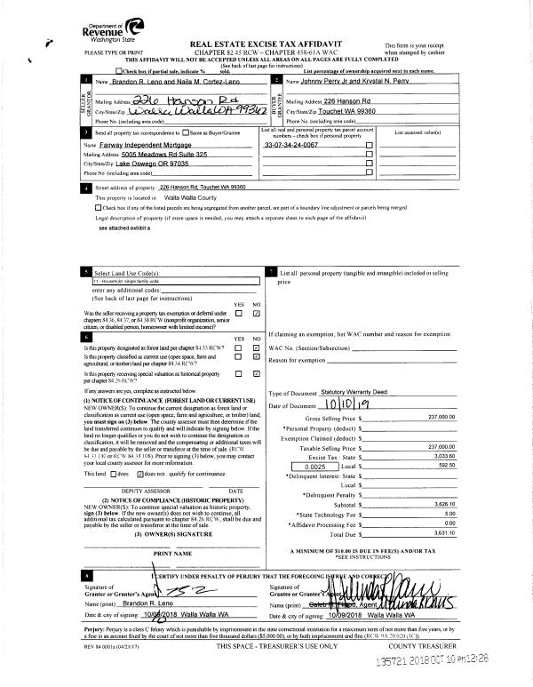 | 1 | 10/10/2018 | SWD | STATUTORY WARRANTY DEED | LENO BRANDON R | PERRY JOHNNY JR & KRYSTAL N | | | $237,000.00 | 135721 | 2018-08426 |