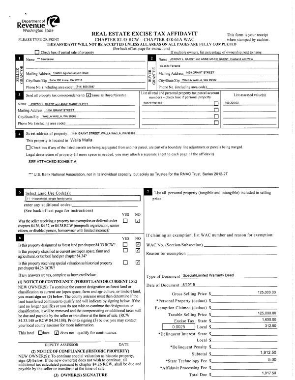 | 1 | 09/14/2015 | SWD | STATUTORY WARRANTY DEED | RMAC TRUST SERIES 2012-2T | GUEST JEREMY L & ANNE MARIE | | | $125,000.00 | 128808 | 2015-08042 |