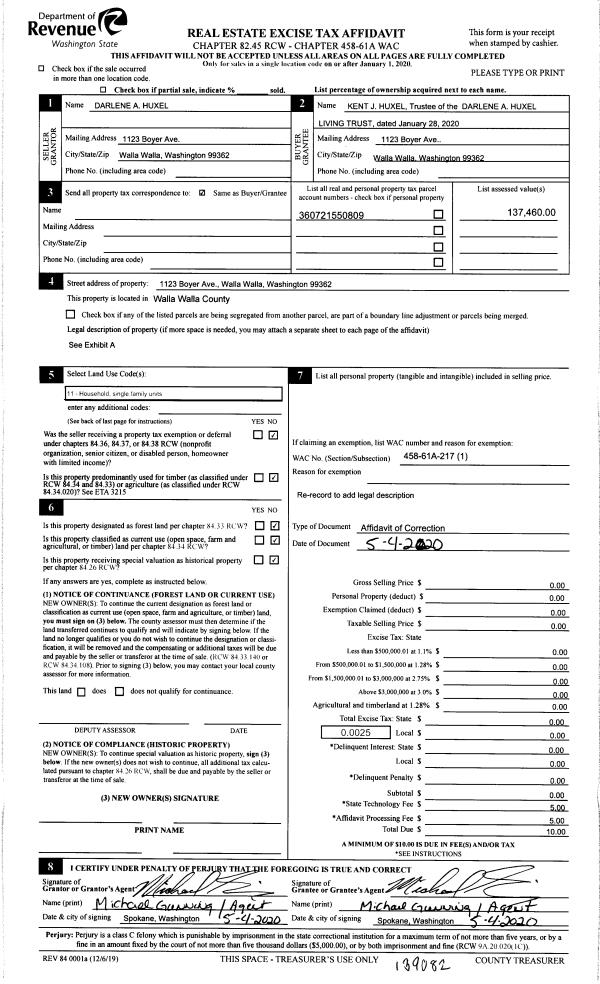 | 1 | 05/04/2020 | AFFIDAVIT | AFFIDAVIT | HUXEL DARLENE A | HUXEL LIVING TRUST | | | $0.00 | 139082 | 2020-04063 |