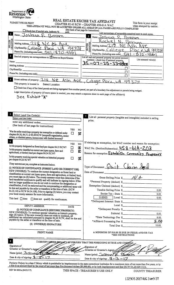 | 1 | 08/03/2017 | QCD | QUIT CLAIM DEED | BORAM JOSHUA P | BORAM RACHEL & JOSHUA P | | | $0.00 | 132904 | 2017-05903 |