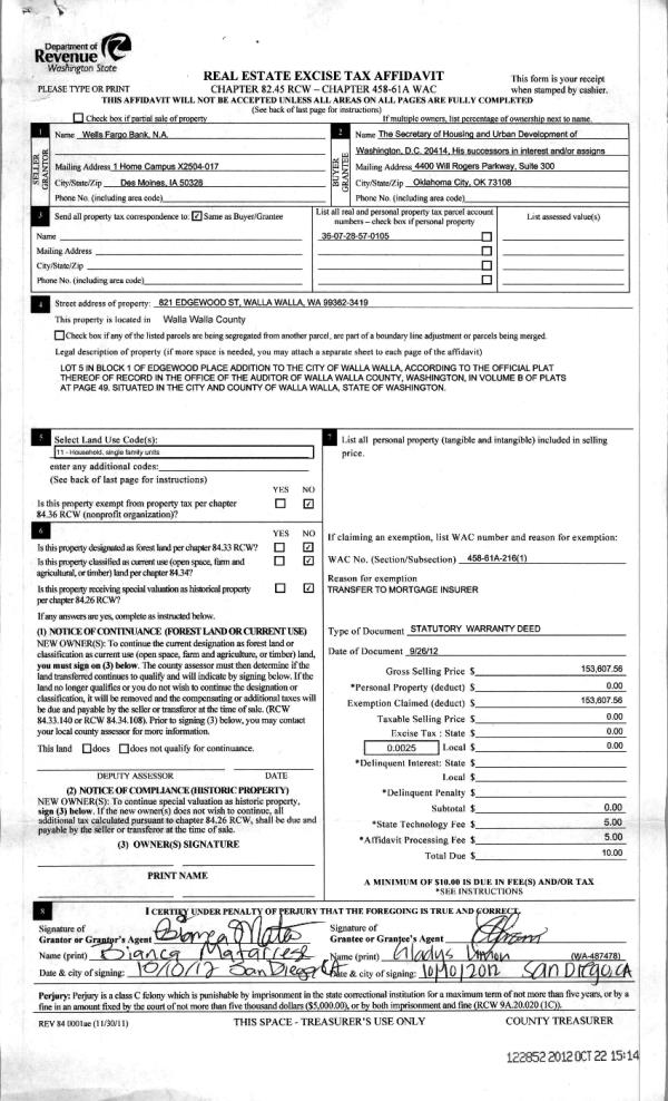 | 4 | 10/22/2012 | WARRANTY D | WARRANTY DEED | WELLS FARGO BANK NA | SECRETARY OF HOUSING & URBAN D | | | $153,607.00 | 122852 | 2012-09290 |