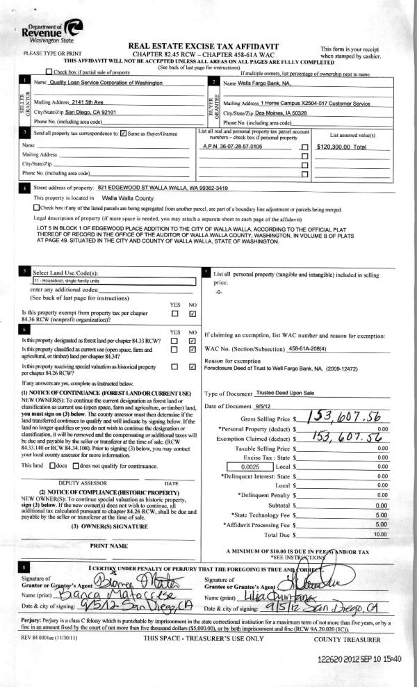 | 5 | 09/10/2012 | WARRANTY D | WARRANTY DEED | QUALITY LOAN SERVICE CORPORATI | WELLS FARGO BANK NA | | | $153,607.00 | 122620 | 2012-07890 |