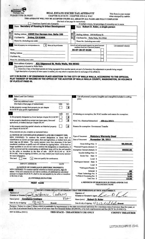 | 3 | 04/05/2013 | WARRANTY D | WARRANTY DEED | SECRETARY OF HOUSING & URBAN D | KOLAR, ROBERT D | | | $99,000.00 | 123739 | 2013-03305 |