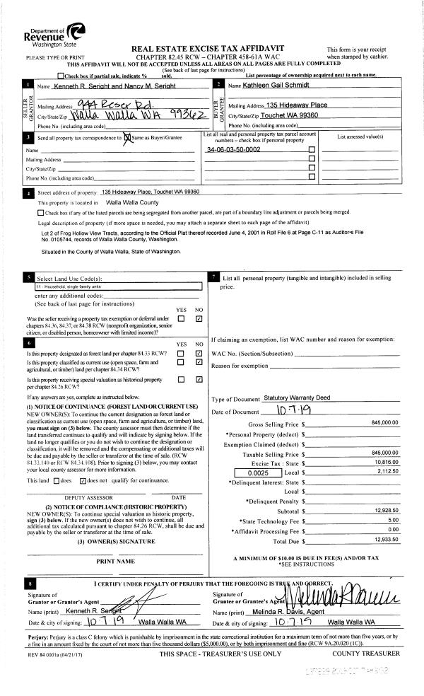 | 1 | 10/07/2019 | SWD | STATUTORY WARRANTY DEED | SERIGHT KENNETH R & NANCY M | SCHMIDT KATHLEEN GAIL | | | $845,000.00 | 137829 | 2019-07989 |