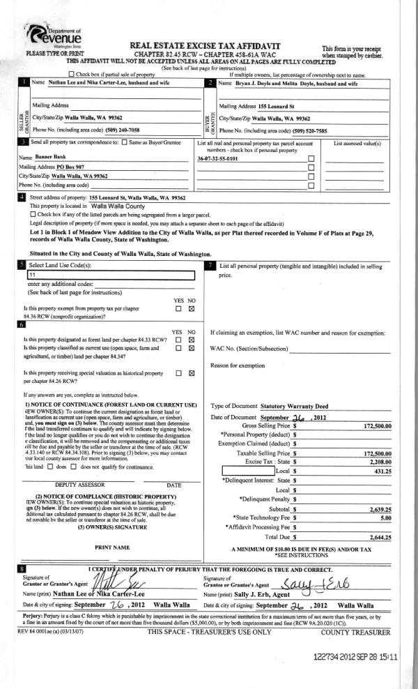 | 3 | 09/28/2012 | WARRANTY D | WARRANTY DEED | LEE, NATHAN | DOYLE, BRYAN J & MELITA | | | $172,500.00 | 122734 | 2012-08566 |
