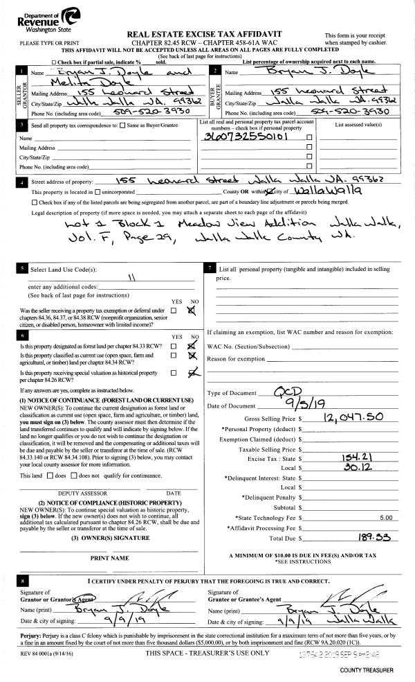 | 2 | 09/05/2019 | QCD | QUIT CLAIM DEED | DOYLE BRYAN J & MELITA | DOYLE BRYAN J | | | $12,048.00 | 137642 | 2019-07039 |