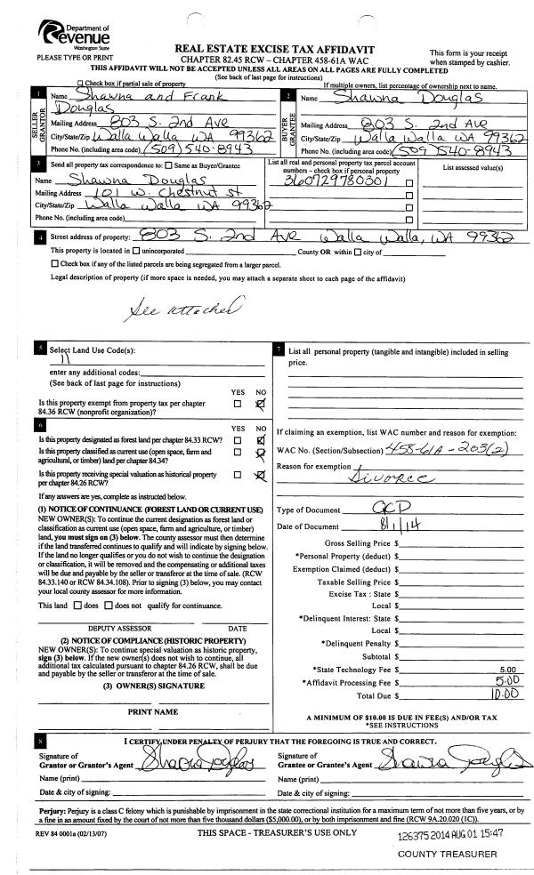 | 5 | 08/01/2014 | QCD | QUIT CLAIM DEED | DOUGLAS FRANK & SHAWNA | DOUGLAS SHAWNA | | | | 126375 | 2014-05500 |
