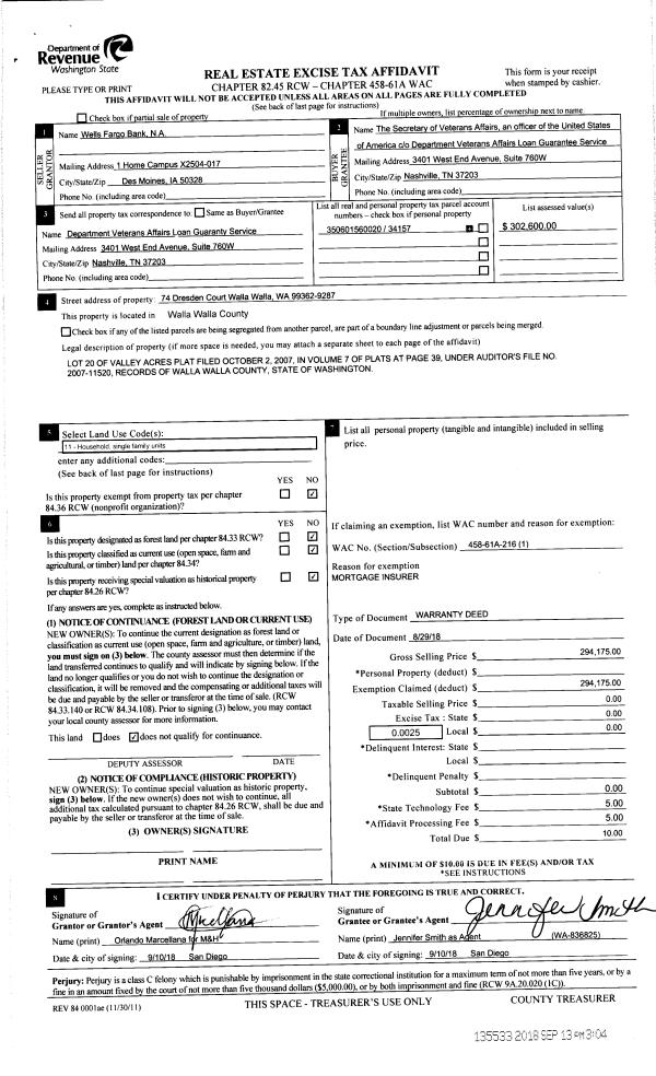 | 3 | 09/13/2018 | WARRANTY D | WARRANTY DEED | WELLS FARGO BANK | SECRETARY OF VETERANS AFFAIRS | | | $294,175.00 | 135533 | 2018-07633 |