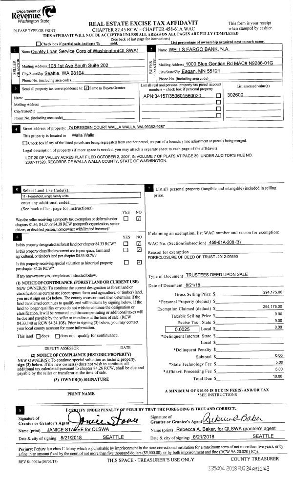 | 4 | 08/24/2018 | TRUSTEES D | TRUSTEE'S DEED | BIDDISCOMBE WILLY | WELLS FARGO BANK | | | $294,175.00 | 135404 | 2018-07009 |