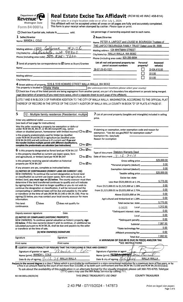 | 1 | 07/15/2024 | SWD | STATUTORY WARRANTY DEED | COLE WANDA L | LINFOOT/BOURASSA FAMILY TRUST | | | $525,000.00 | 147873 | 2024-03826 |