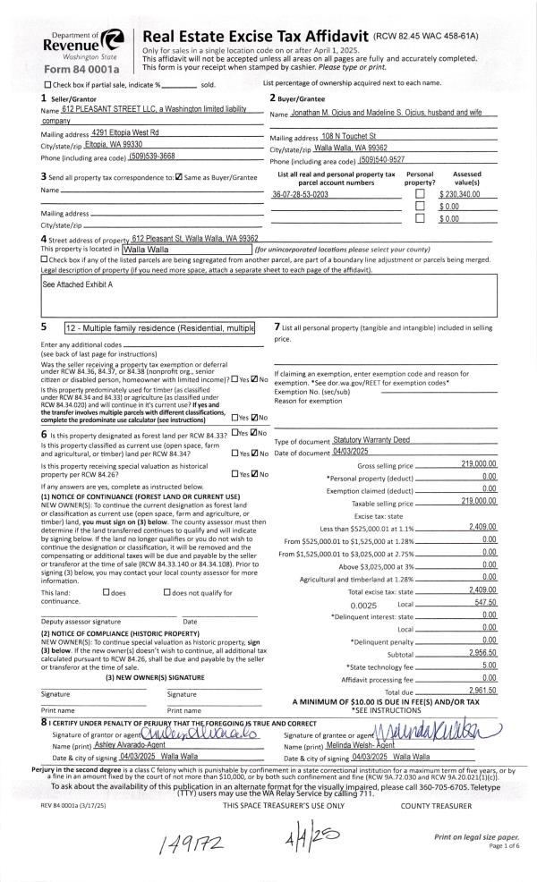 | 1 | 04/04/2025 | SWD | STATUTORY WARRANTY DEED | 612 PLEASANT STREET LLC | OJCIUS JONATHAN M & MADELINE S | | | $219,000.00 | 149172 | 2025-01778 |
