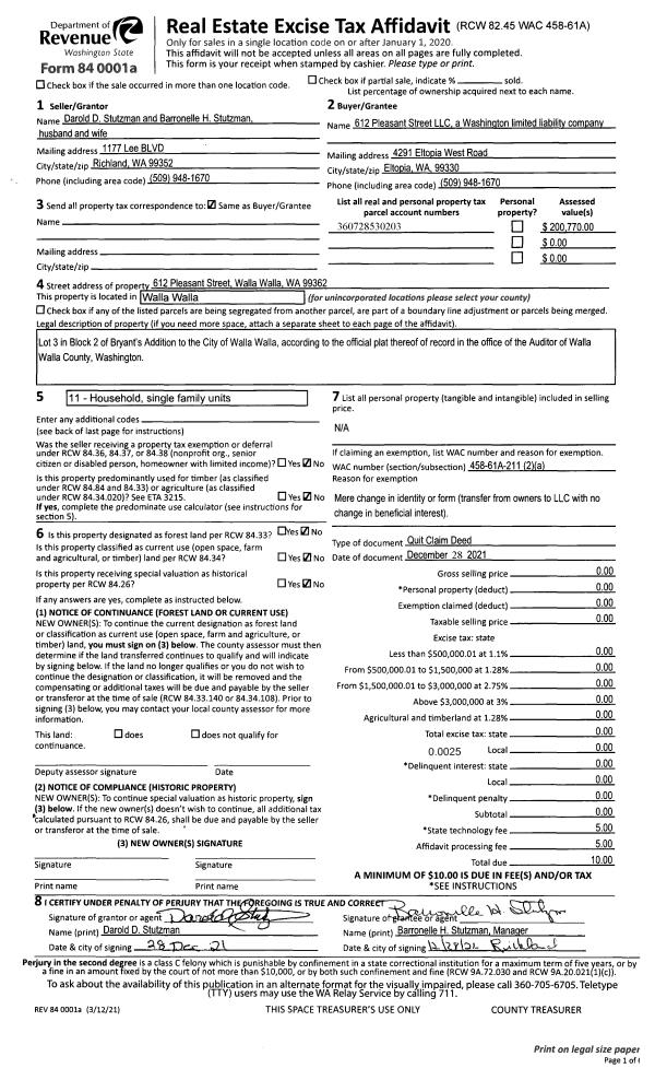 | 2 | 12/28/2021 | QCD | QUIT CLAIM DEED | STUTZMAN DAROLD D & BARRONELLE H | 612 PLEASANT STREET LLC | | | $0.00 | 143274 | 2022-00619 |