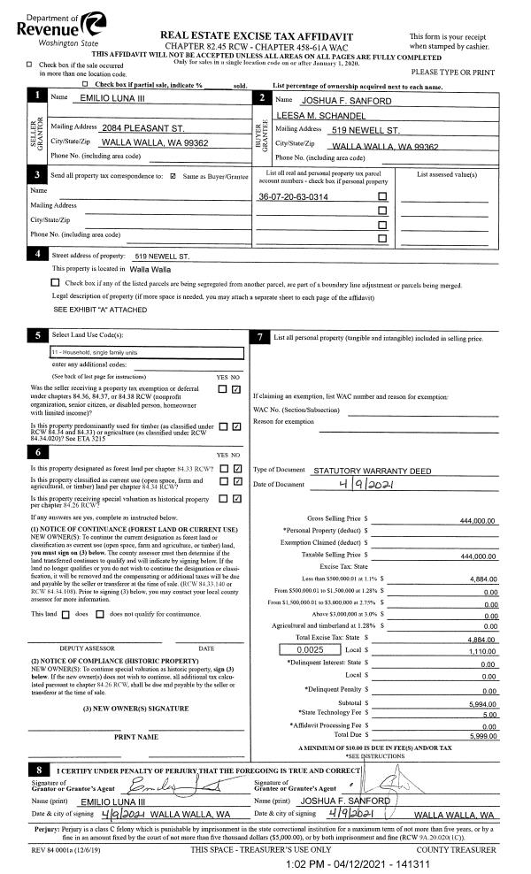 | 1 | 04/12/2021 | SWD | STATUTORY WARRANTY DEED | LUNA EMILIO III | SANFORD JOSHUA F & LEESA M SCHANDEL | | | $444,000.00 | 141311 | 2021-04242 |
