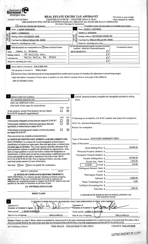 | 4 | 10/05/2012 | WARRANTY D | WARRANTY DEED | ROBINSON, J MARK & MARY J | MC EWEN, JAMES A & KERRY A | | | $84,000.00 | 122762 | 2012-08802 |