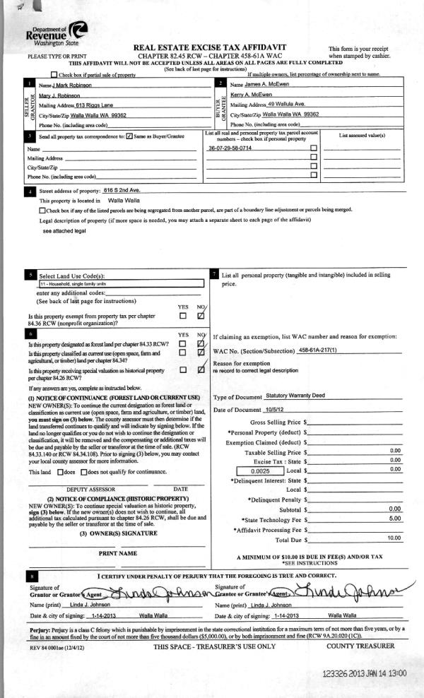 | 3 | 01/14/2013 | WARRANTY D | WARRANTY DEED | ROBINSON, J MARK & MARY J | MC EWEN, JAMES A & KERRY A | | | $0.00 | 123326 | 2013-00431 |