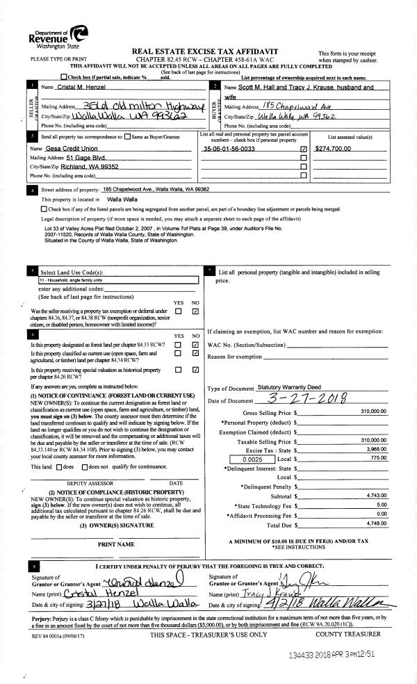 | 2 | 04/03/2018 | SWD | STATUTORY WARRANTY DEED | HENZEL NICHOLAS T & CRISTAL M | HALL SCOTT M | | | $310,000.00 | 134433 | 2018-02575 |