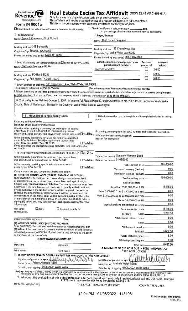 | 1 | 01/06/2022 | SWD | STATUTORY WARRANTY DEED | HALL SCOTT M | FERGUSON ALLEN ROBERT | | | $495,000.00 | 143196 | 2022-00211 |