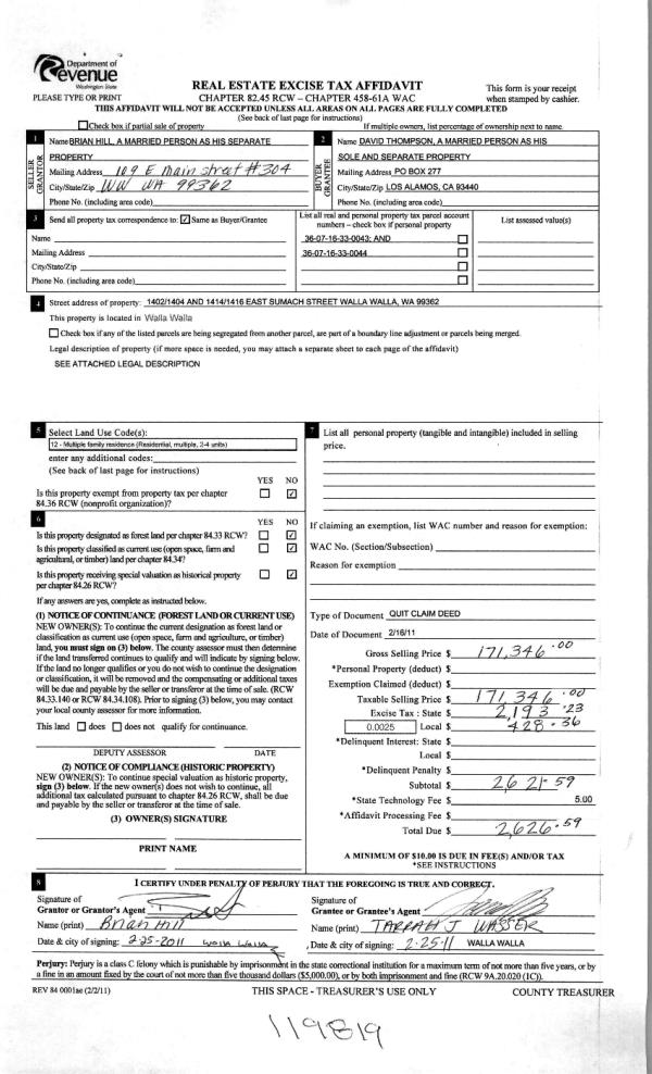 | 1 | 03/01/2011 | QCD | QUIT CLAIM DEED | THOMPSON DAVID W | THOMPSON DAVID | | | $171,346.00 | 119819 | 2011-01907 |