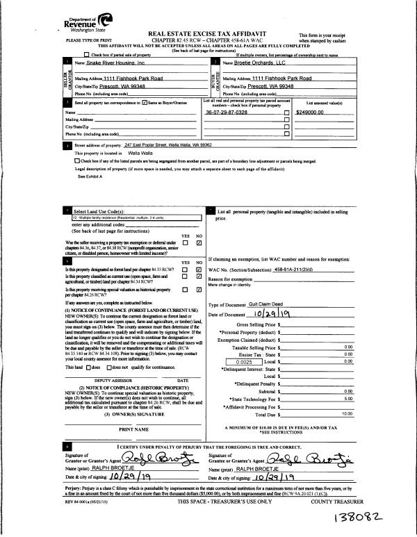 | 3 | 10/29/2019 | QCD | QUIT CLAIM DEED | SNAKE RIVER HOUSING INC | BROETJE ORCHARDS LLC | | | $0.00 | 138082 | 2019-09413 |