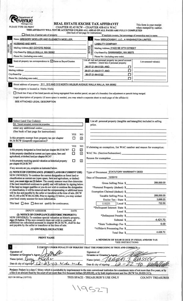 | 3 | 12/28/2010 | WARRANTY D | WARRANTY DEED | MOELLER GREGORY & ELIZABETH | WKHUCKABAY LLC | | | | 119527 | 2010-10768 |