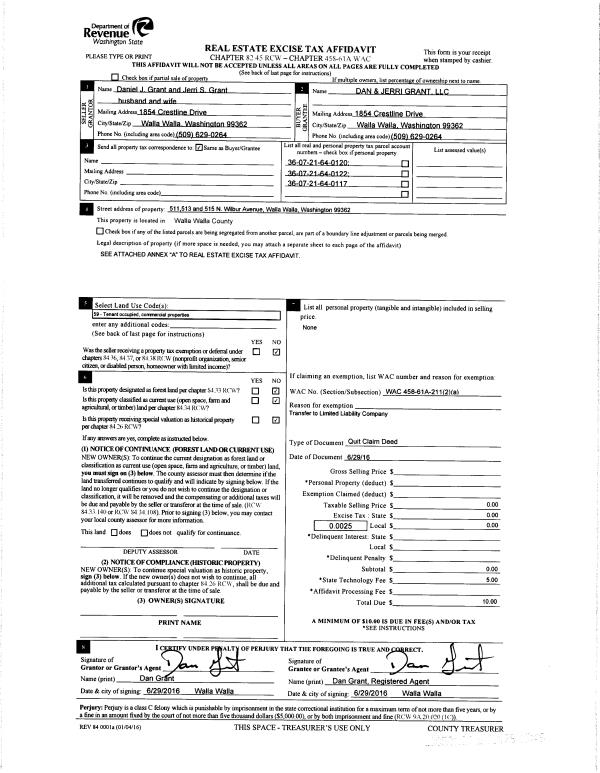 | 1 | 06/29/2016 | QCD | QUIT CLAIM DEED | GRANT DANIEL J & JERRI S | GRANT DAN & JERRI LLC | | | $0.00 | 130521 | 2016-05029 |