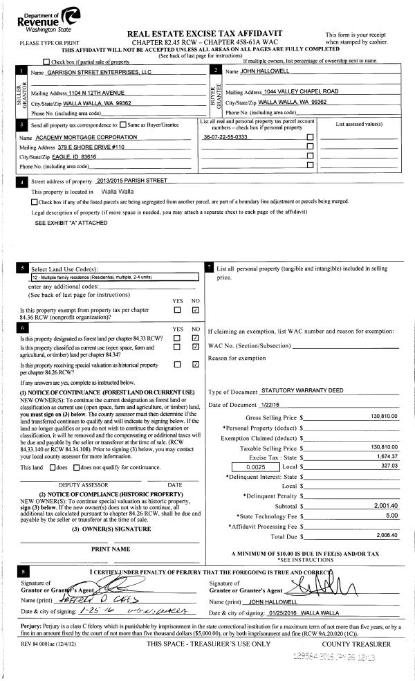 | 1 | 01/26/2016 | SWD | STATUTORY WARRANTY DEED | GARRISON STREET ENTERPRISES LLC | HALLOWELL JOHN | | | $130,810.00 | 129564 | 2016-00607 |