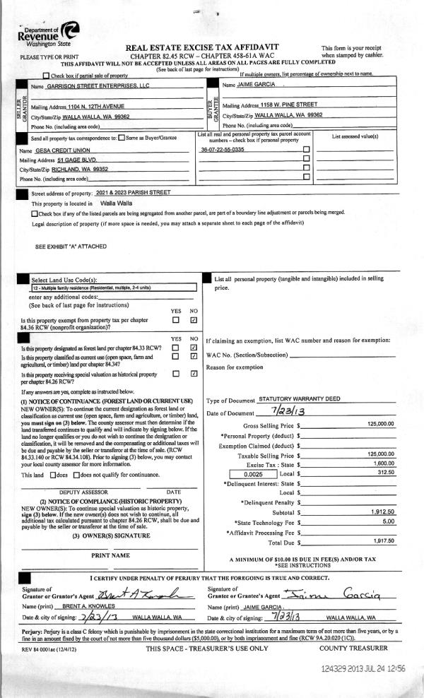 | 2 | 07/24/2013 | WARRANTY D | WARRANTY DEED | GARRISON STREET ENTERPRISES LL | GARCIA, JAMIE | | | $125,000.00 | 124329 | 2013-07460 |