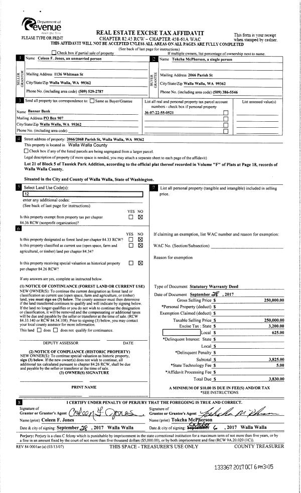 | 1 | 10/06/2017 | SWD | STATUTORY WARRANTY DEED | JONES COLEEN | MCPHERSON TOKCHA | | | $250,000.00 | 133367 | 2017-07961 |