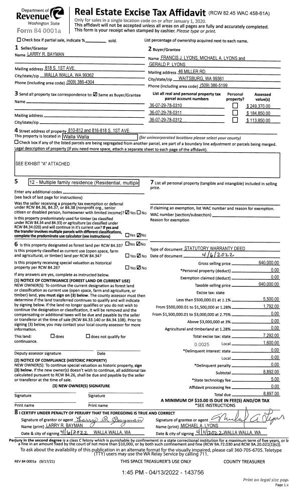 | 2 | 04/13/2022 | SWD | STATUTORY WARRANTY DEED | BAYMAN LARRY R | LYONS FRANCIS J | | 3-PARCELS | $640,000.00 | 143756 | 2022-03111 |