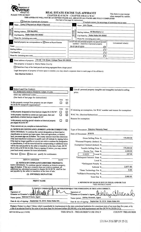 | 1 | 09/19/2016 | SWD | STATUTORY WARRANTY DEED | REYNARD COREY S | ROYSE JOHN | | | $175,000.00 | 131064 | 2016-07648 |