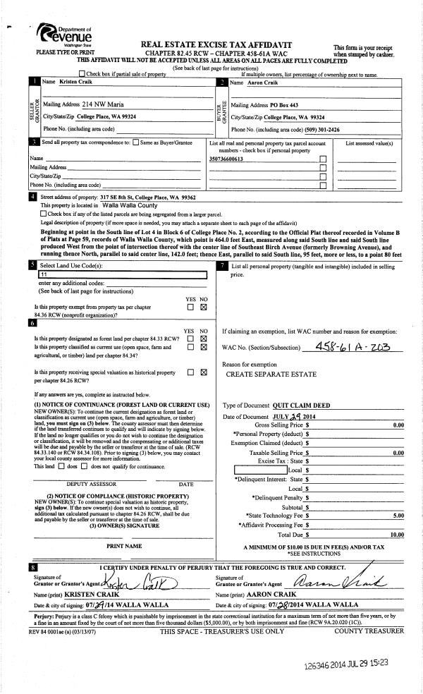 | 1 | 07/29/2014 | QCD | QUIT CLAIM DEED | CRAIK AARON & KRISTEN | CRAIK AARON | | | | 126346 | 2014-05380 |