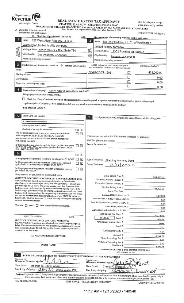 | 1 | 12/15/2020 | SWD | STATUTORY WARRANTY DEED | 129 WEST ALDER PROPERTY LLC | MCFEELY BUILDING LLC | | | $388,500.00 | 140548 | 2020-13256 |