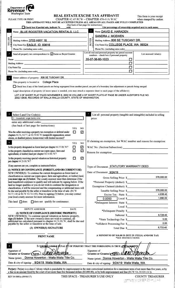 | 1 | 09/25/2019 | SWD | STATUTORY WARRANTY DEED | BLUE ROOSTER VACATION RENTALS LLC | HARADEN DAVID E | | | $378,000.00 | 137745 | 2019-07569 |