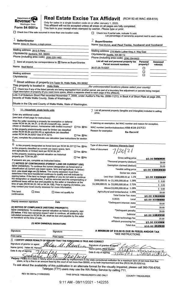 | 1 | 07/20/2021 | SWD | STATUTORY WARRANTY DEED | HANSEN HELEN M | MYRICK NEAL & PAUL TESKE | | | $0.00 | 142255 | 2021-09756 |